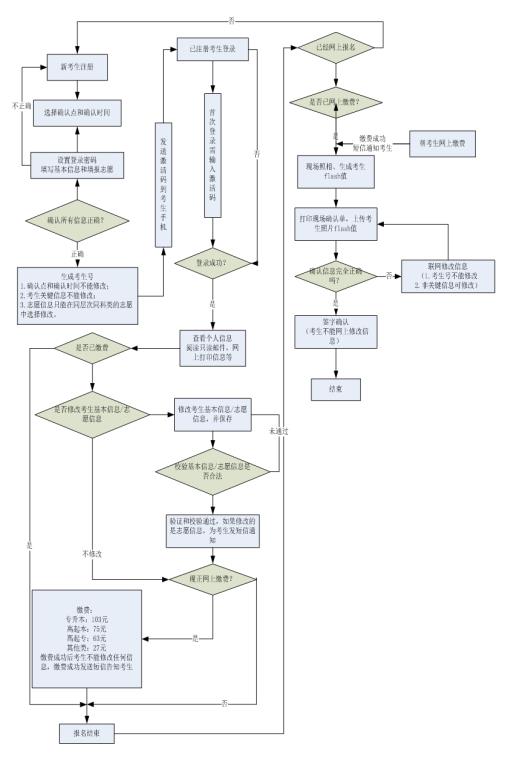 第十八条 我省成人高招报名实行网上报名。网上报名分考生网上输入报名信息和报名信息现场确认两个阶段。在报名信息现场确认阶段,网上报名系统仍接收考生在网上输入报名信息。详细工作流程如下图所示: