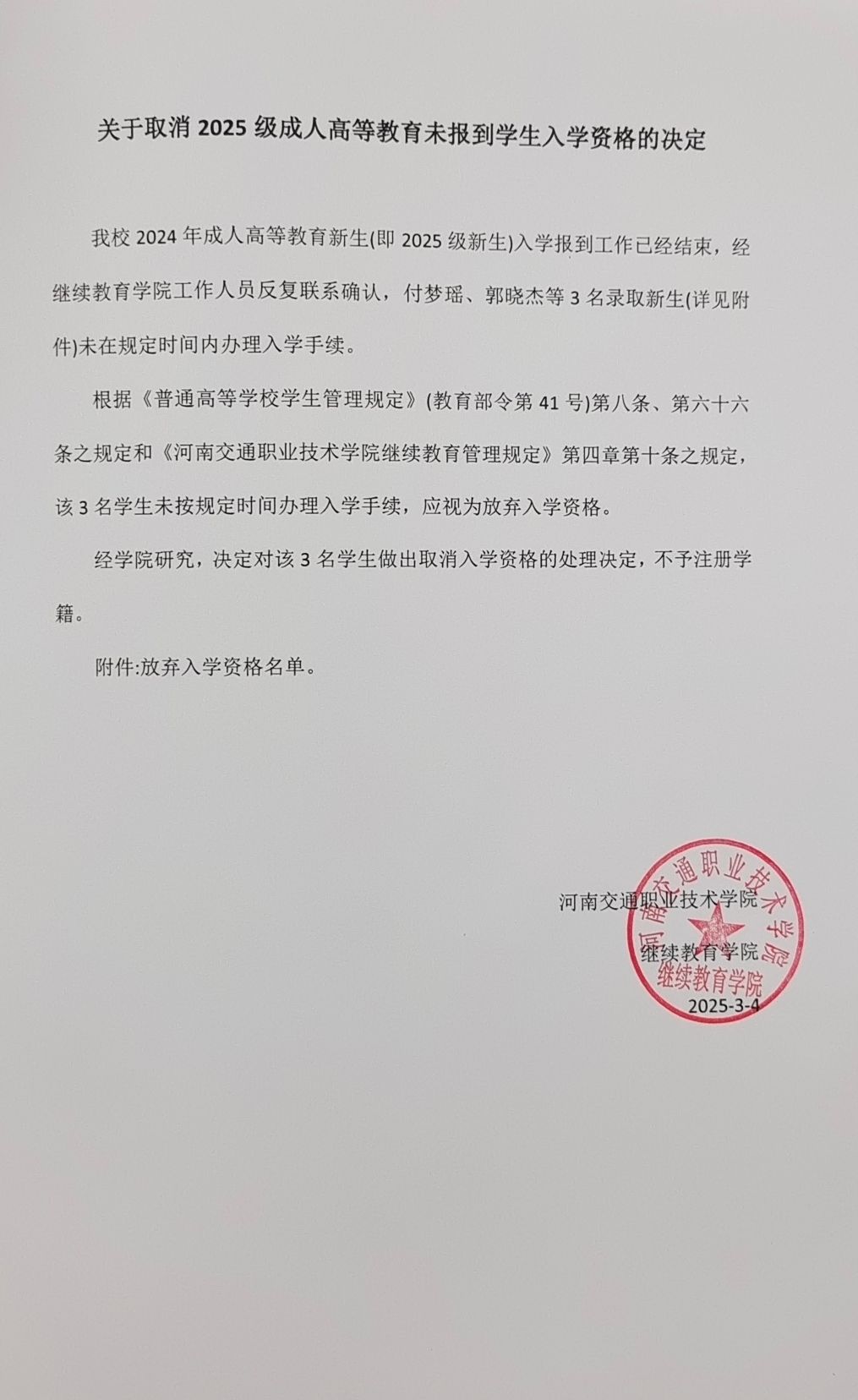我校2024年成人高等教育新生(即2025级新生)入学报到工作已经结束,经继续教育学院工作人员反复联系确认,付梦瑶、郭晓杰等3名录取新生(详见附件)未在规定时间内办理入学手续。