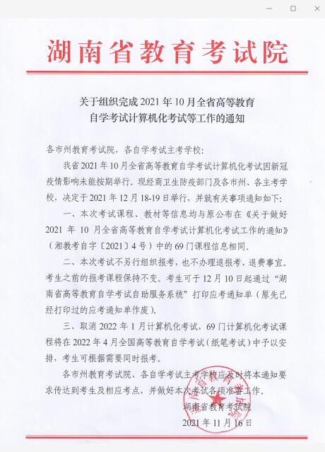 关于组织完成2021年10月全省高等教育自学考试计算机化考试等工作的通知