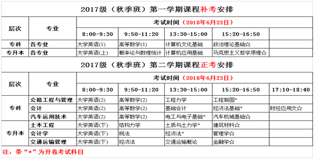 根据北京交通大学现代远程教育教学计划的安排,现将2017级(秋季班)专科、专升本各专业第二学期课程教学及考试安排通知如下: